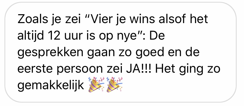✓ 1:1 support van mij via Voxer. Ik bied je altijd een luisterend oor, een vraag of advies en juich keihard met je mee als een Braziliaanse voetbalspeler, of je nu scoort of niet.